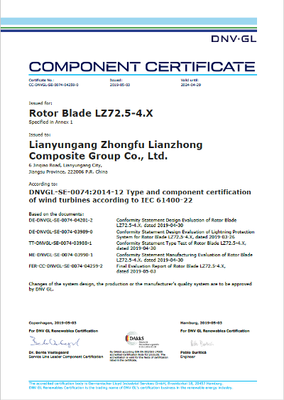近日,中復連眾收到了DNV GL德國總部發(fā)布的LZ72.5-4.X風(fēng)電葉片型式認證A證書(shū)。該證書(shū)是迄今為止DNV GL頒發(fā)給國內的首張符合IEC標準的4MW級別部件型式認證證書(shū),這標志著(zhù)國際權威機構對中復連眾綜合研發(fā)實(shí)力和制造品質(zhì)的充分認可。另外該型號也是目前國內獲得DNV GL A型式認證證書(shū)中長(cháng)度最長(cháng)、功率最高的葉片。