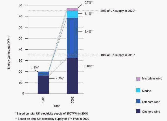 到2020年,英國可再生能源的發(fā)展規劃如下:1250萬(wàn)千瓦的陸地風(fēng)電場(chǎng)裝機容量;1150萬(wàn)千瓦的海上風(fēng)電場(chǎng)的裝機容量;300萬(wàn)千瓦的海洋可再生能源。