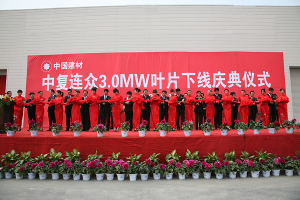 10月18日,連云港中復連眾復合材料集團的葉片工廠(chǎng)和連云港市文化藝術(shù)中心花團錦簇,中復連眾3兆瓦風(fēng)力葉片下線(xiàn)儀式和20周年慶典隆重舉行。國務(wù)院國資委監事會(huì )主任陳琦良,國家工信部規劃司副司長(cháng)劉樹(shù)蘋(píng),國家科技部能源處副處長(cháng)譚可榮,中國建筑材料集團公司總經(jīng)理姚燕,中國建材集團外部董事曹德生、王振侯、郭建堂,中國建筑材料聯(lián)合會(huì )副會(huì )長(cháng)陳國慶,中國建材報社社長(cháng)陳才來(lái),中國復合材料集團有限公司董事長(cháng)張定金,華銳風(fēng)電科技股份有限公司董事長(cháng)、總裁韓俊良,金風(fēng)科技股份有限公司總裁郭健等參加了3兆瓦葉片下線(xiàn)儀式和中復連眾成立20周年慶典。