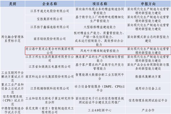 2018年8月10日,工信部公布了《2018年制造業(yè)與互聯(lián)網(wǎng)融合發(fā)展試點(diǎn)示范項目名單》,項目總計立項125個(gè),江蘇省11個(gè)項目入圍。其中,中復連眾所申報的“風(fēng)電葉片精益制造管控能力” 項目成功入選兩化融合管理體系貫標示范項目。